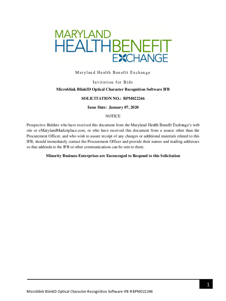 Maryland Health Benefit Exchange Invitation for Bids Microblink Blinked Optical Character Recognition Software IF SOLICITATION NO.: BPM022246 Issue Date: January 07, 2020, NOTICE Prospective Bidders