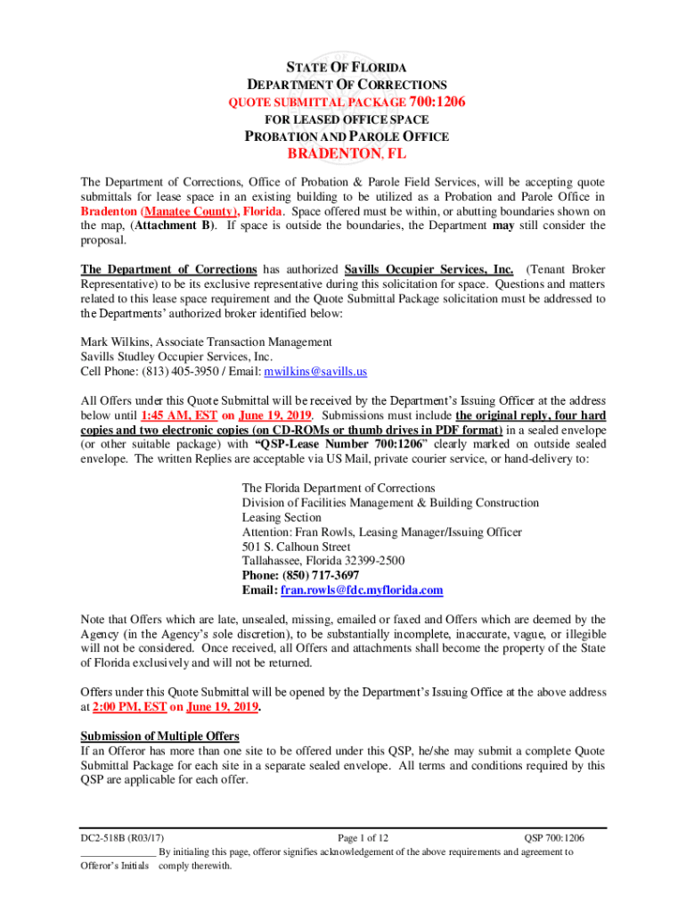 STATE OF FLORIDA DEPARTMENT OF CORRECTIONS QUOTE SUBMITTAL PACKAGE 700:1206 FOR LEASED OFFICE SPACE PROBATION AND PAROLE OFFICEBRADENTON, FL The Department of Corrections, Office of Probation & Parole