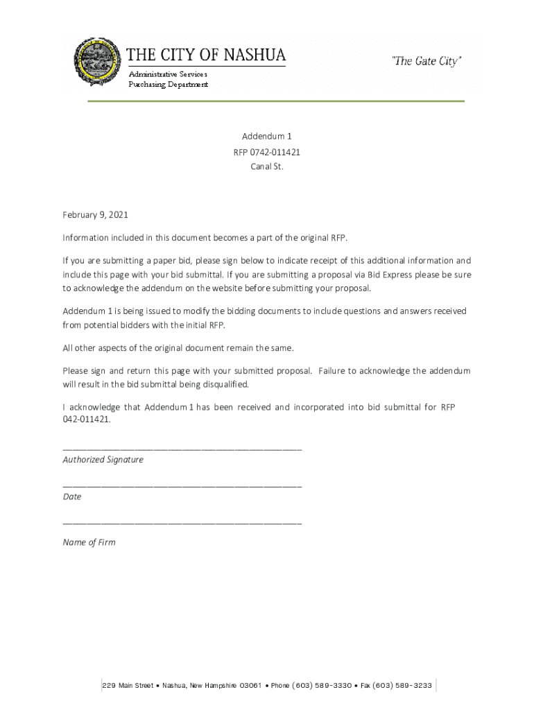Addendum 1 RFP 0742011421 Canal St. February 9, 2021, Information included in this document becomes a part of the original RFP. If you are submitting a paper bid, please sign below to indicate receipt