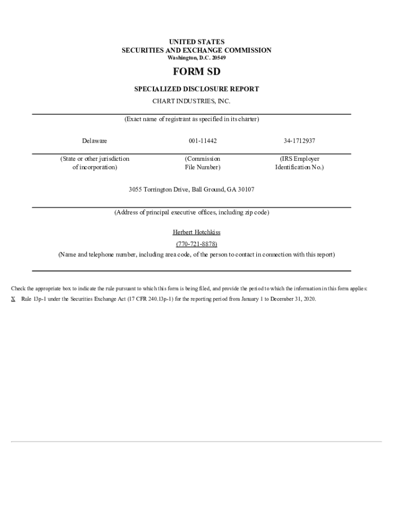 UNITED STATES SECURITIES AND EXCHANGE COMMISSION Washington, D.C. 20549FORM SD SPECIALIZED DISCLOSURE REPORT CHART INDUSTRIES, INC. (Exact name of registrant as specified in its charter) Delaware00111442341712937(State
