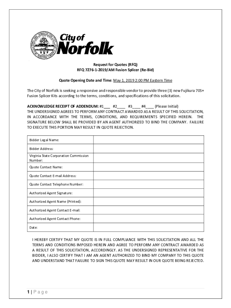 Request for Quotes (RFQ) RFQ 727612019/AM Fusion Splicer (Rebid) Quote Opening Date and Time: May 1, 2019 2:00 PM Eastern Time The City of Norfolk is seeking a responsive and responsible vendor to