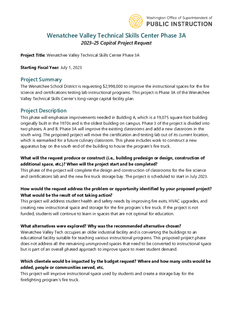 Wenatchee Valley Technical Skills Center Phase 3A 202325 Capital Project Request Project Title: Wenatchee Valley Technical Skills Center Phase 3A Starting Fiscal Year: July 1, 2023Project Summary