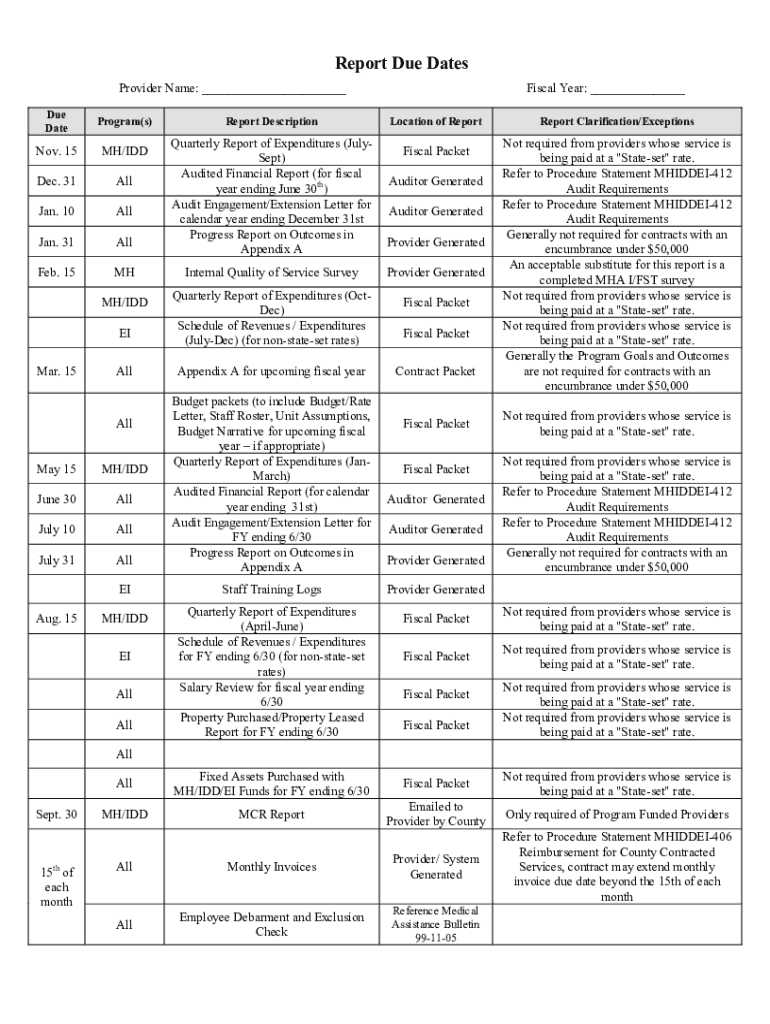 Report Due Dates Provider Name: ___ Due Deprogram(s)Nov. 15MH/ADDEC. 31AllJan. 10AllJan. 31AllFeb. 15MH MH/ADD EI Mar. 15AllAll May 15MH/mid-June 30AllJuly 10AllJuly 31All EI Aug. 15MH/ID DEI All