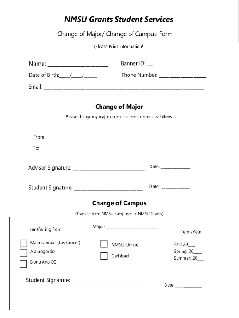MSU Grants Student Services Change of Major/ Change of Campus Form (Please Print Information)Name: ___Banner ID: ___Date of Birth:_/__/_Phone Number: ___Email: ___Change of Major Please change my