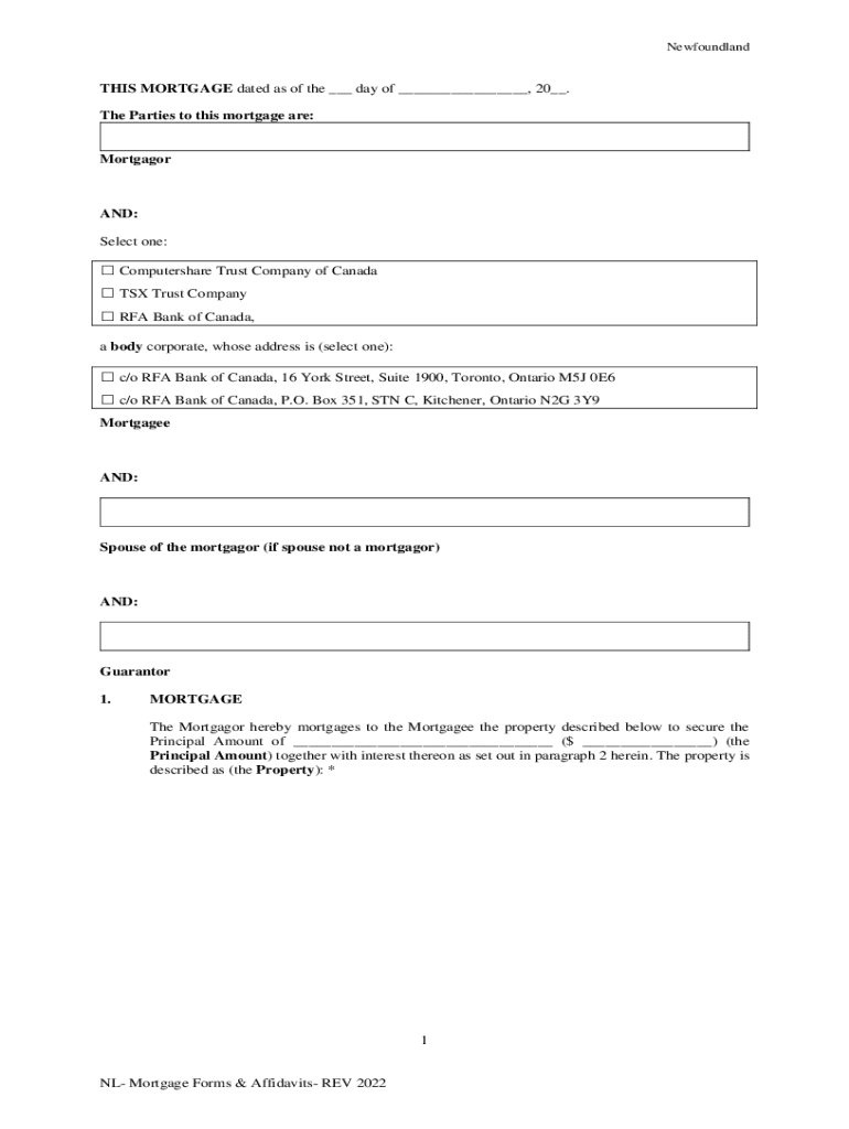 Newfoundlands MORTGAGE dated as of the ___ day of ___, 20__. The Parties to this mortgage are:Mortgagor AND: Select one: Computer share Trust Company of Canada TSX Trust Company RFA Bank of Canada,