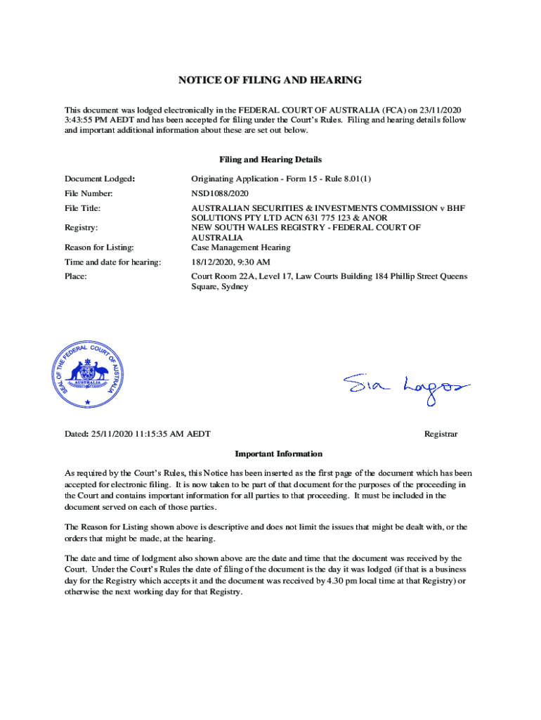 Get the free notice of filing and hearing - ASIC