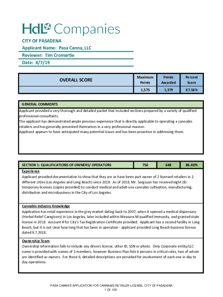 CITY OF PASADENA Applicant Name: Pass Anna, LLC Reviewer: Tim Romantic Date: 4/7/19 OVERALL SCOREMaximum Pinpoints AwardedPercent Score1,5751,37987.56%GENERAL COMMENTS Applicant provided a very thorough