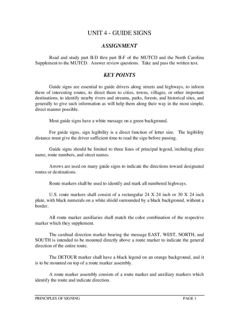 UNIT 4 GUIDE SIGNS ASSIGNMENT Read and study part DID through part IIF of the MUTED and the North Carolina Supplement to the MUTED. Answer review questions. Take and pass the written test.KEY POINTS