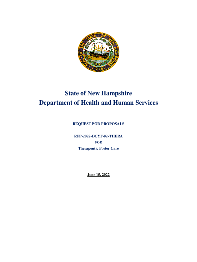 State of New Hampshire Department of Health and Human Services REQUEST FOR PROPOSALS RFP2022DCYF02THERA Therapeutic Foster Care June 15, 2022STATE OF NEW HAMPSHIRE DEPARTMENT OF HEALTH AND HUMAN SERVICES