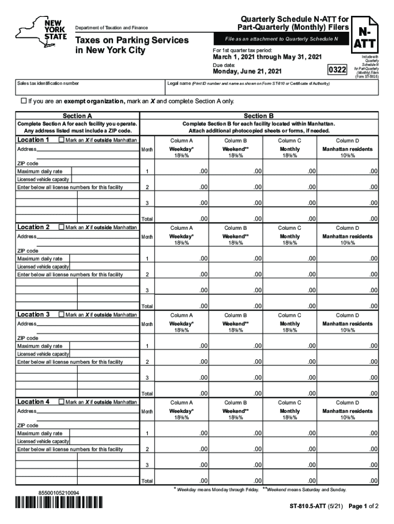 Quarterly Schedule NATO for PartQuarterly (Monthly) FilersDepartment of Taxation and FinanceTaxes on Parking Services in New York Citywide as an attachment to Quarterly Schedule N For 1st quarter