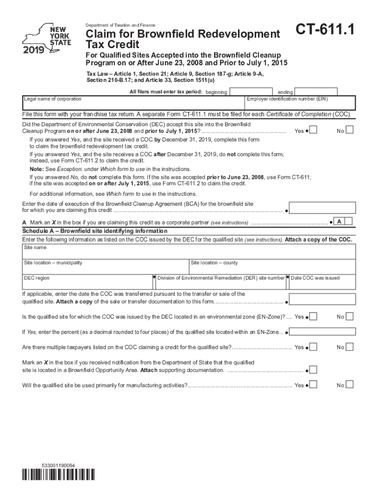 Department of Taxation and FinanceClaim for Brownfield Redevelopment Tax CreditCT611.1For Qualified Sites Accepted into the Brownfield Cleanup Program on or After June 23, 2008, and Prior to July