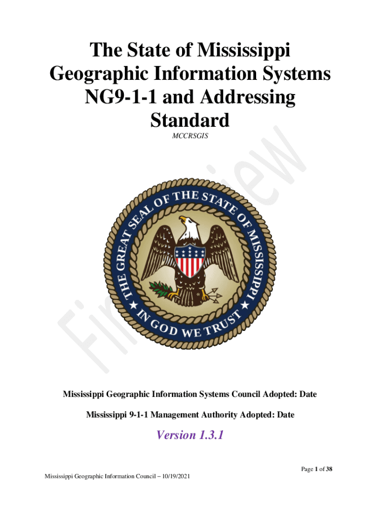 The State of Mississippi Geographic Information Systems NG911 and Addressing Standard MCCRSGISMississippi Geographic Information Systems Council Adopted: Date Mississippi 911 Management Authority