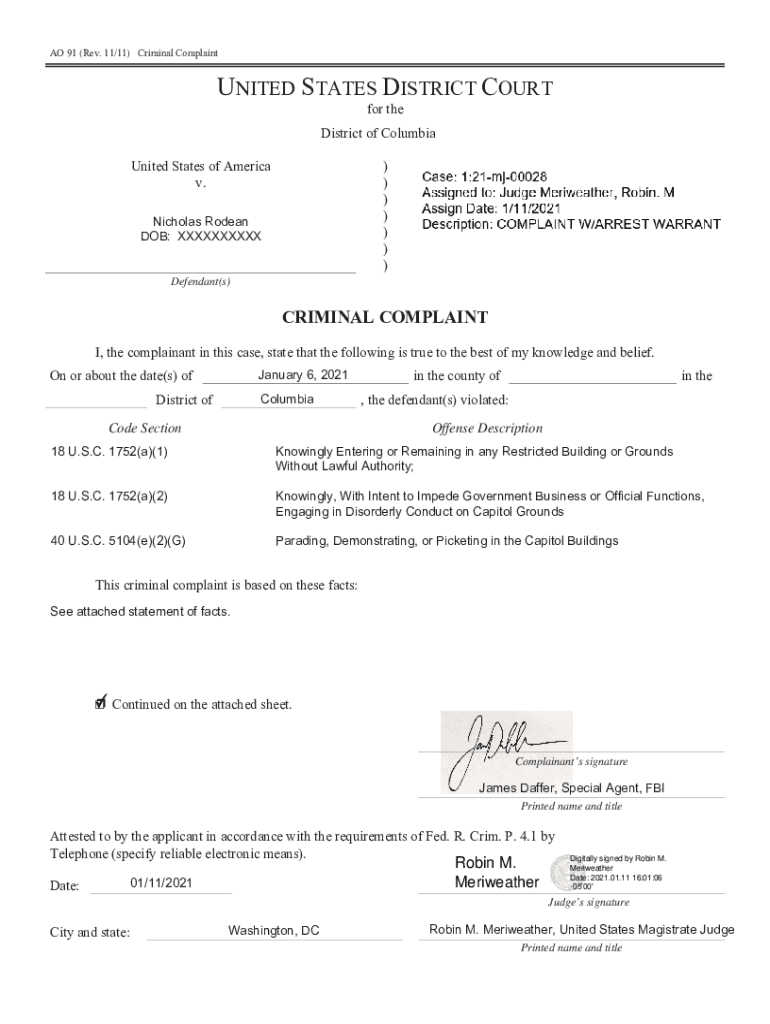 AO 91 (Rev. 11/11) Criminal ComplaintUNITED STATES DISTRICT COURT for theDistrictDistrict of Columbia ___ of ___ United States of America v.) ))))))Nicholas Rode an DOB: XXXXXXXXXXCase No. Defendant(s)CRIMINAL
