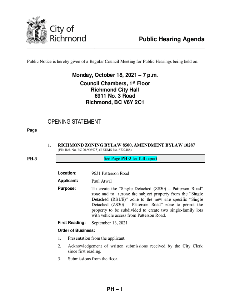 Public Hearing AgendaPublic Notice is hereby given of a Regular Council Meeting for Public Hearings being held on:Monday, October 18, 2021 7 p.m. Council Chambers, 1st Floor Richmond City Hall 6911