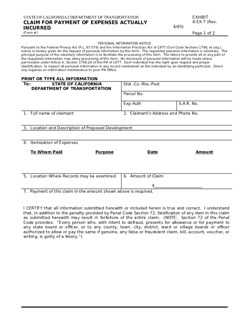 What is CLAIM FOR PAYMENT OF EXPENSES ACTUALLY INCURRED - dot ca Form?