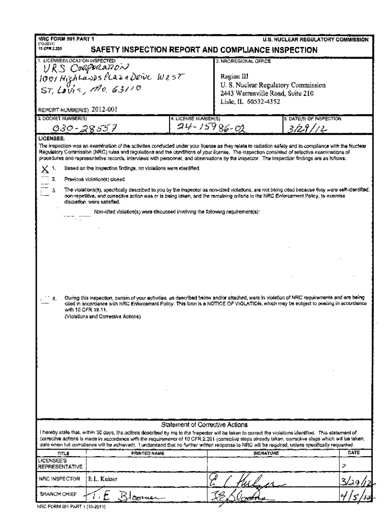 NRC FORM 591 PART 1U. S. NUCLEAR REGULATORY COMMISSION(102011)SAFETY INSPECTION REPORT AND COMPLIANCE INSPECTION10CFR2.2011. LlCENSEEILOCATION INSPECTED:2. NRC/REGIONAL OFFICE j(S Catnip(tap() \';JJ(J