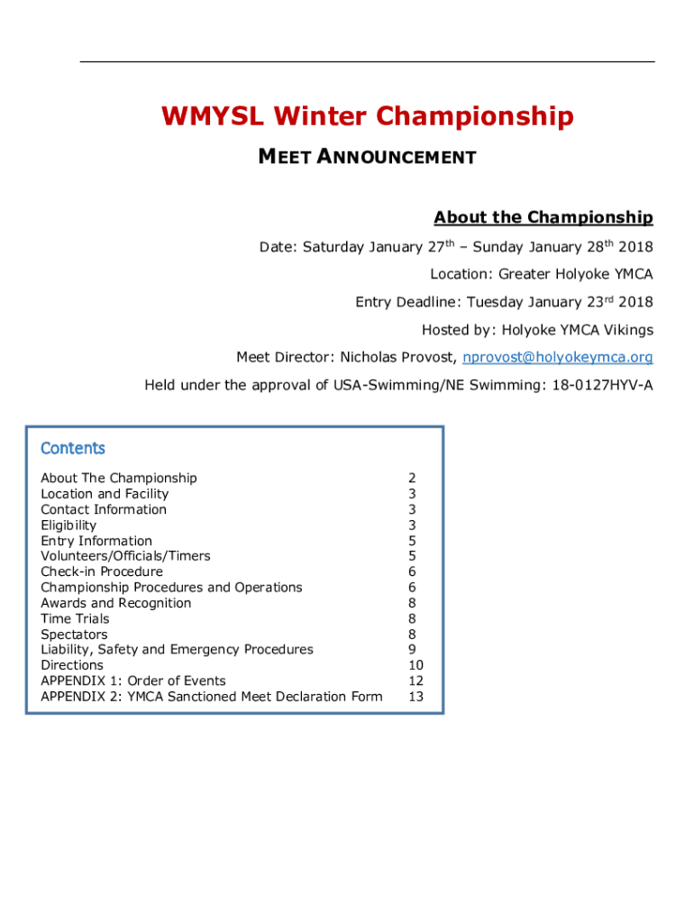 WAYS Winter Championship MEET ANNOUNCEMENT About the Championship Date: Saturday, January 27th Sunday, January 28th 2018 Location: Greater Holyoke YMCA Entry Deadline: Tuesday, January 23rd 2018 Hosted