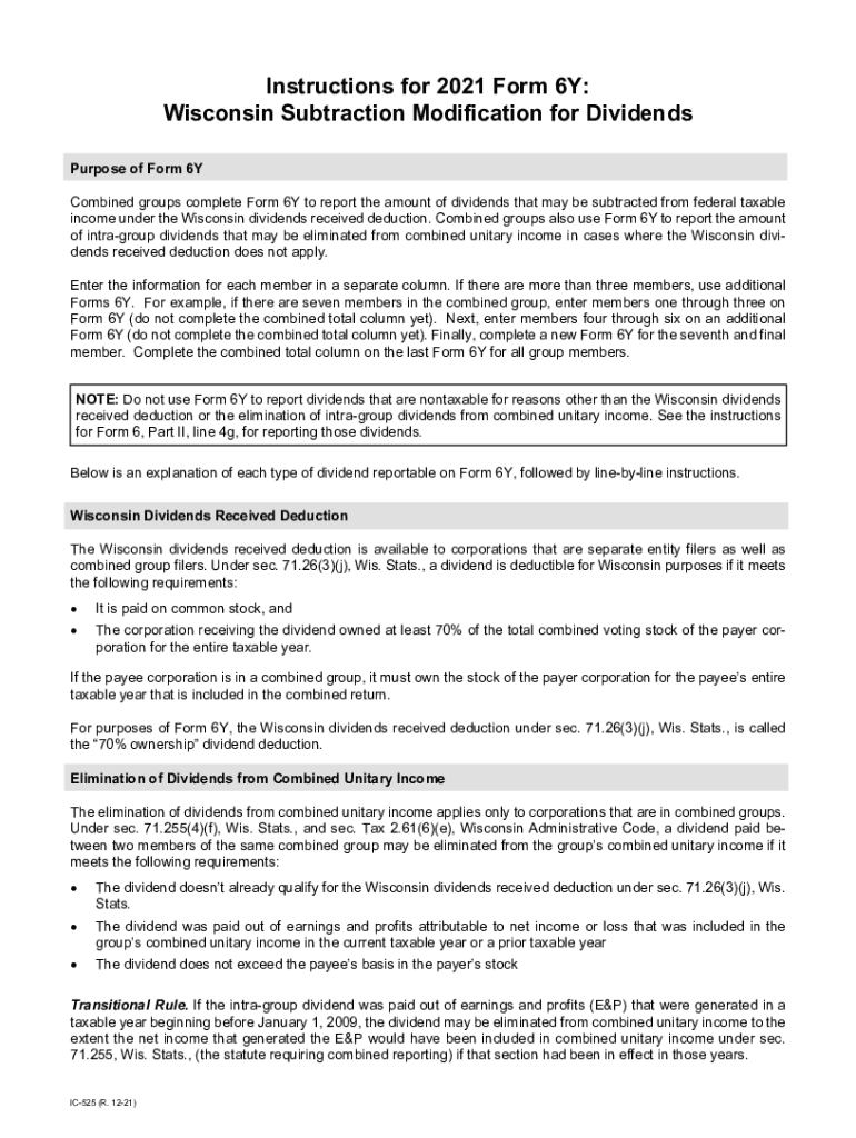 Instructions for 2021 Form 6Y: Wisconsin Subtraction Modification for Dividends Purpose of Form 6Y Combined groups complete Form 6Y to report the amount of dividends that may be subtracted from federal