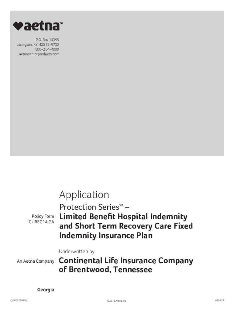 P.O. Box 14399 Lexington, KY 405129700 8002644000 aetnaseniorproducts. Complication Protection Series Limited Benefit Hospital Indemnity and Short Term Recovery Care Fixed Indemnity Insurance Plan