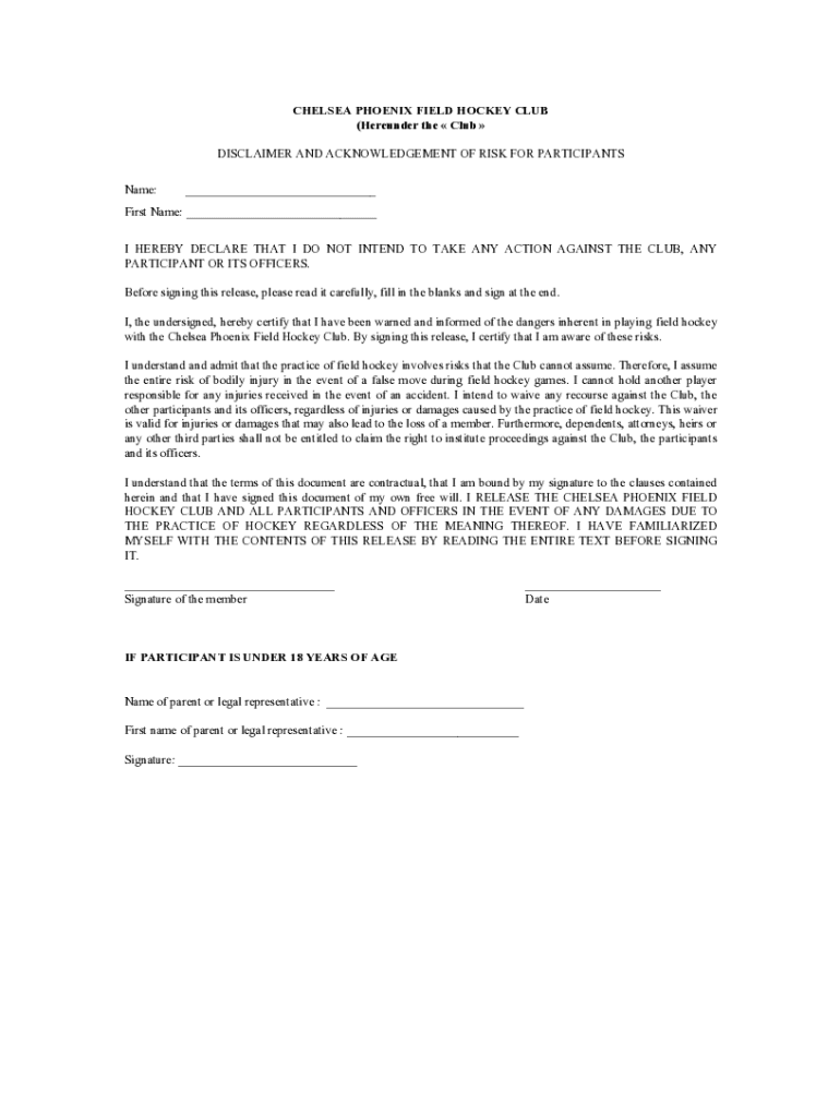CHELSEA PHOENIX FIELD HOCKEY CLUB (Hereunder the Club DISCLAIMER AND ACKNOWLEDGEMENT OF RISK FOR PARTICIPANTS Name:___First Name: ___ I HEREBY DECLARE THAT I DO NOT INTEND TO TAKE ANY ACTION AGAINST