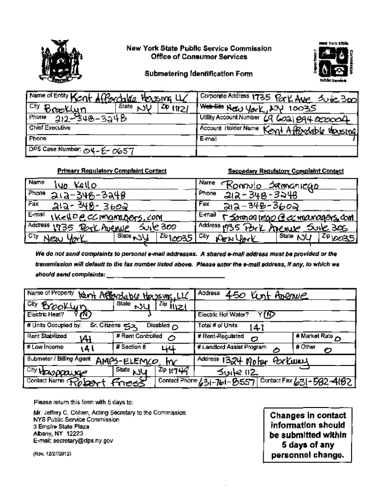 New York State Public Service Commission Office of Consumer Services Submetering Identification Form Name of Entity (+ J City 1:) Phone, FY)... Lid\” (\'you/I State NV I Zip 1Ir21r. 1\'1\” 11lj.@\'3dq