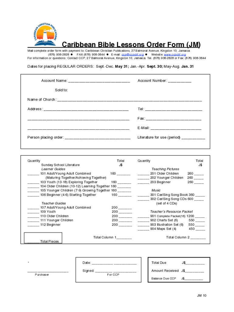 Caribbean Bible Lessons Order Form (JM) Mail complete order form with payment to: Caribbean Christian Publications, 27 Balm oral Avenue, Kingston 10, Jamaica (876) 9062828 ! FAX (876) 9083844 ! Email: