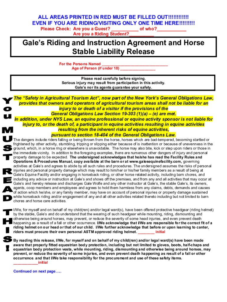 ALL AREAS PRINTED IN RED MUST BE FILLED OUT!!!!!!!!!!!! EVEN IF YOU ARE RIDING/VISITING ONLY ONE TIME HERE!!!!!!!!! Please Check: Are you a Guest? ___ of whom?___ Are you a Riding Student?___Gales