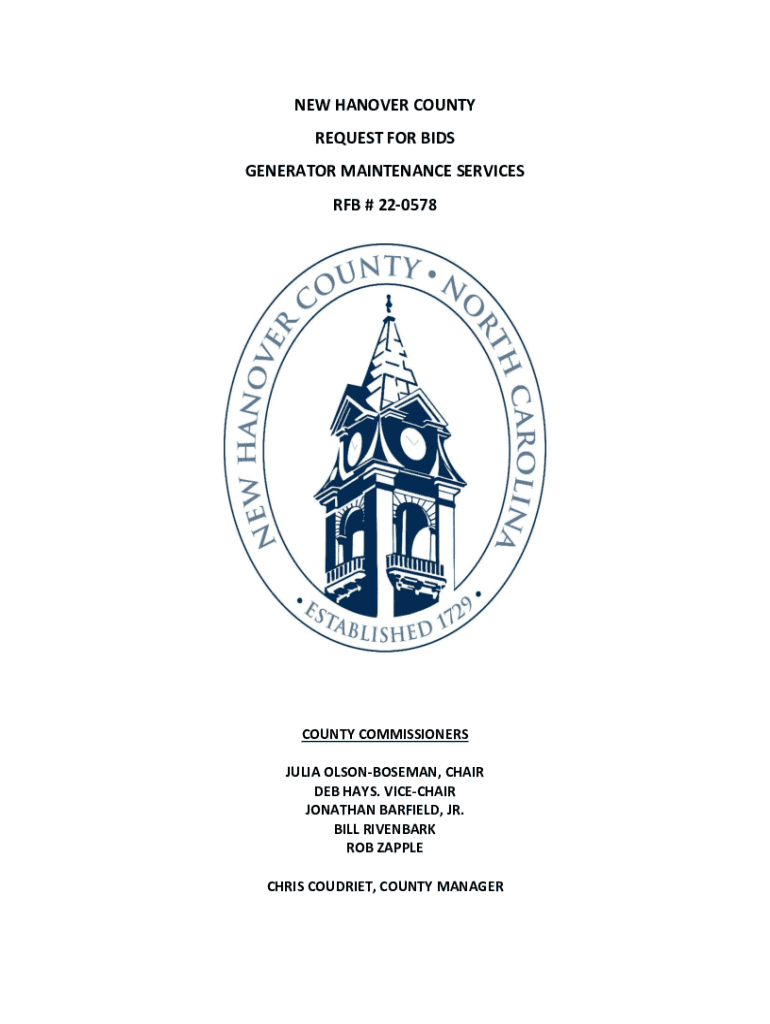 NEW HANOVER COUNTY REQUEST FOR BIDS GENERATOR MAINTENANCE SERVICES ROB # 220578COUNTY COMMISSIONERS JULIA OLSONBOSEMAN, CHAIR DEB HAYS. DECKCHAIR JONATHAN GARFIELD, JR. BILL RIVERBANK ROB APPLE CHRIS
