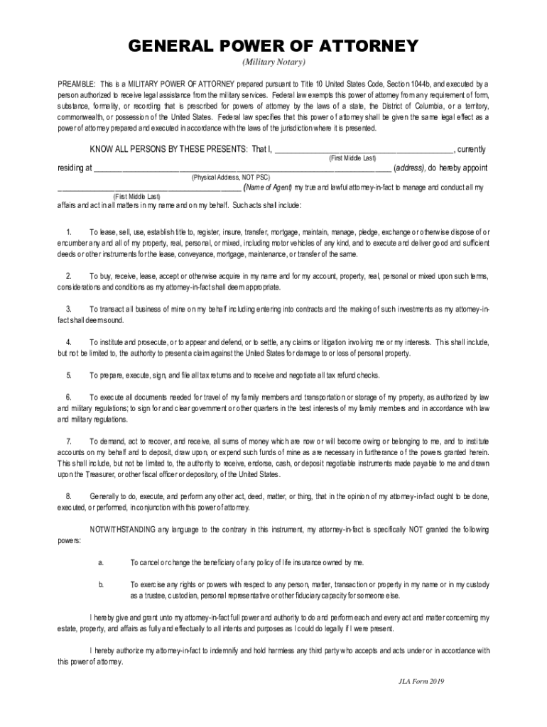 GENERAL POWER OF ATTORNEY (Military Notary) PREAMBLE: This is a MILITARY POWER OF ATTORNEY prepared pursuant to Title 10 United States Code, Section 1044b, and executed by a person authorized to receive