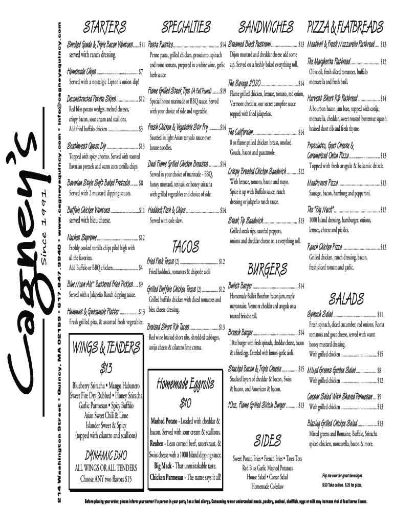 214 Washington Street Quincy, MA 02169 617.847.3940 www.cagneysquincy.com info@cagneysquincy.comSTARTERSSPECIALTIESSANDWICHESPIZZA & FLATBREADSSmoked Gouda & Triple Bacon Wontons......$11 Pasta Rustic.
