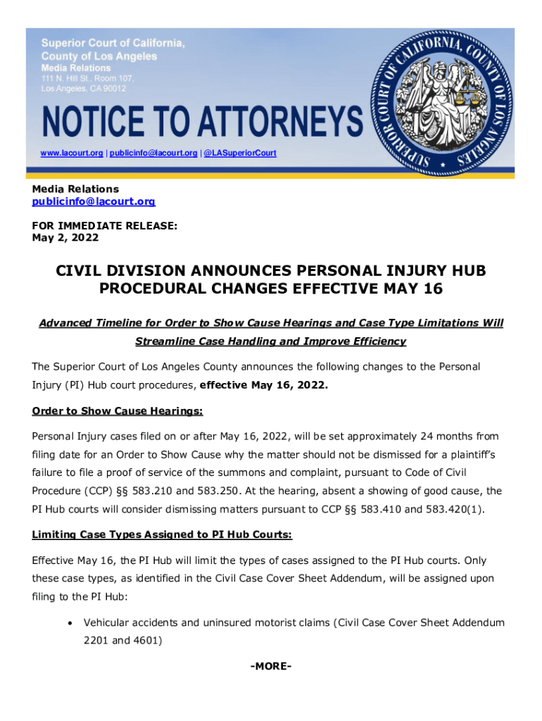WWW.la court.org | publicinfo@lacourt.org | @LASuperiorCourtMedia Relations publicinfo@lacourt.org FOR IMMEDIATE RELEASE: May 2, 2022CIVIL DIVISION ANNOUNCES PERSONAL INJURY HUB PROCEDURAL CHANGES