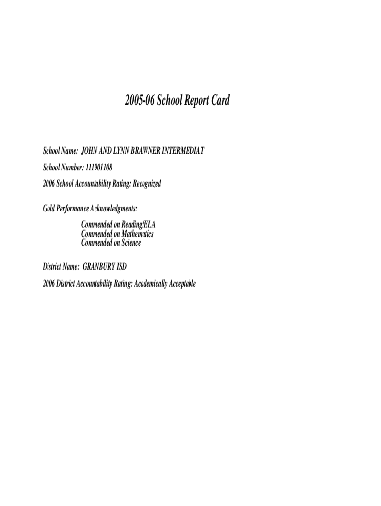 200506 School Report Preschool Names: JOHN AND LYNN BROWNER INTERMEDIATE School Number: 111901108 2006 School Accountability Rating: Recognized Gold Performance Acknowledgments: Commended on Reading/ELA