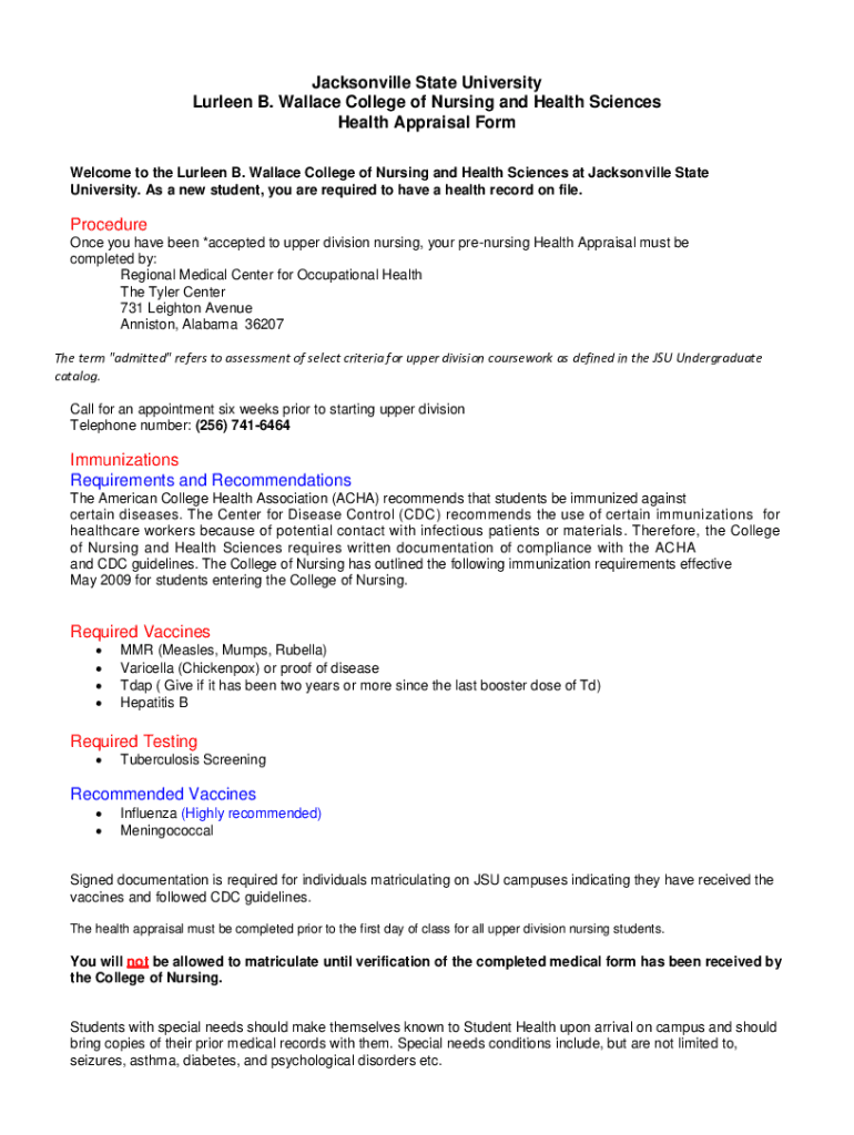 Jacksonville State University Tureen B. Wallace College of Nursing and Health Sciences Health Appraisal Form Welcome to the Tureen B. Wallace College of Nursing and Health Sciences at Jacksonville