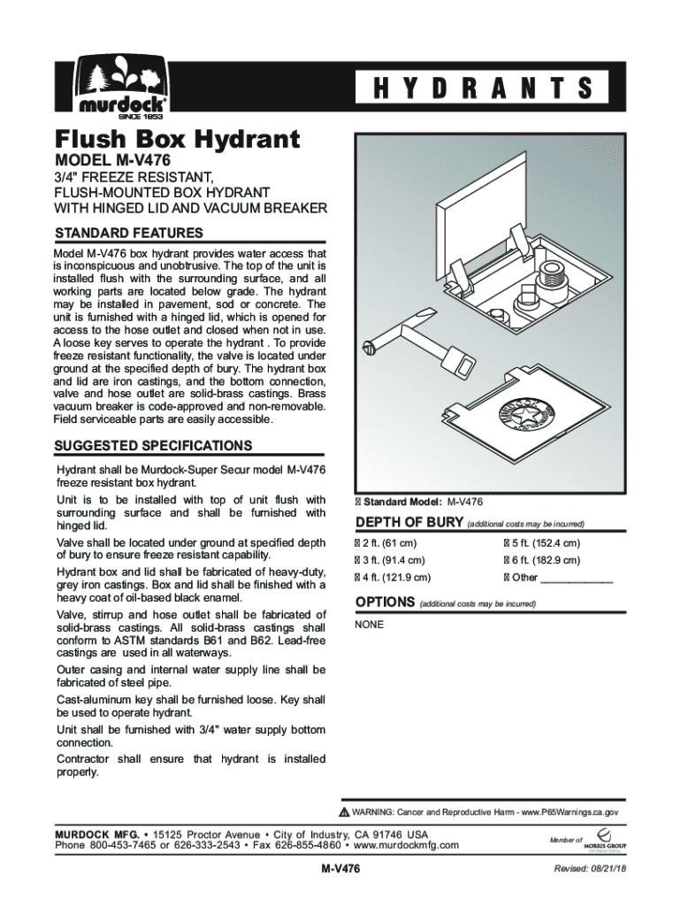 Flush Box Hydrant MODEL MV476 3/4\” FREEZE RESISTANT, FLUSHMOUNTED BOX HYDRANT WITH HINGED LID AND VACUUM BREAKER STANDARD FEATURES Model MV476 box hydrant provides water access that is inconspicuous