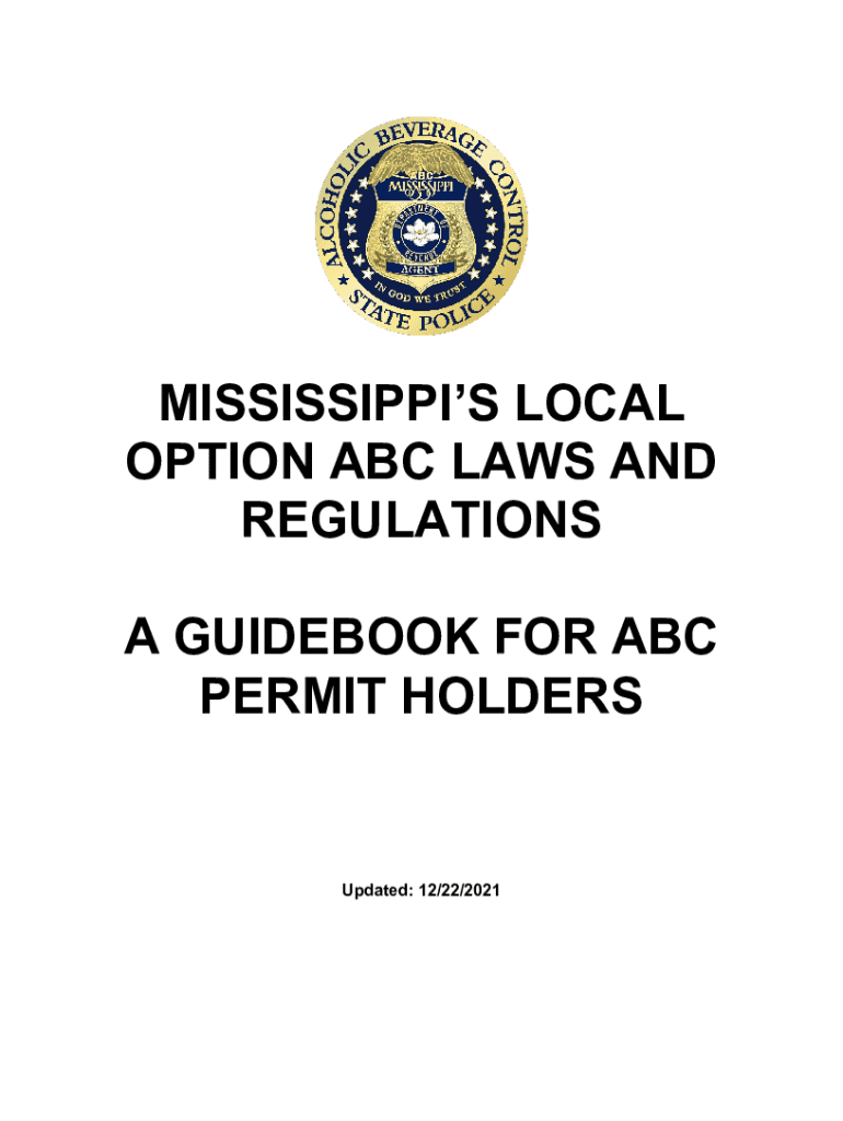 (COVER)MISSISSIPPI LOCAL OPTION ABC LAWS AND REGULATIONS A GUIDEBOOK FOR ABC PERMIT HOLDERSUpdated: 12/22/2021For updates on all ABC laws and guidance, please visit www.dor.ms.gov. Review the items