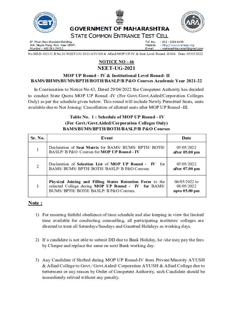 No.MED1021/C.R. No.81/NEETUG 2021/AYUSH & Allied/MOP UPI & Inst. Level Round II/868 Date: 05/05/2022NOTICE NO 46NEETUG2021 MOP UP Round IV & Institutional Level Round II BASS/BMS/BUMS/BOTH/BOTH/BA