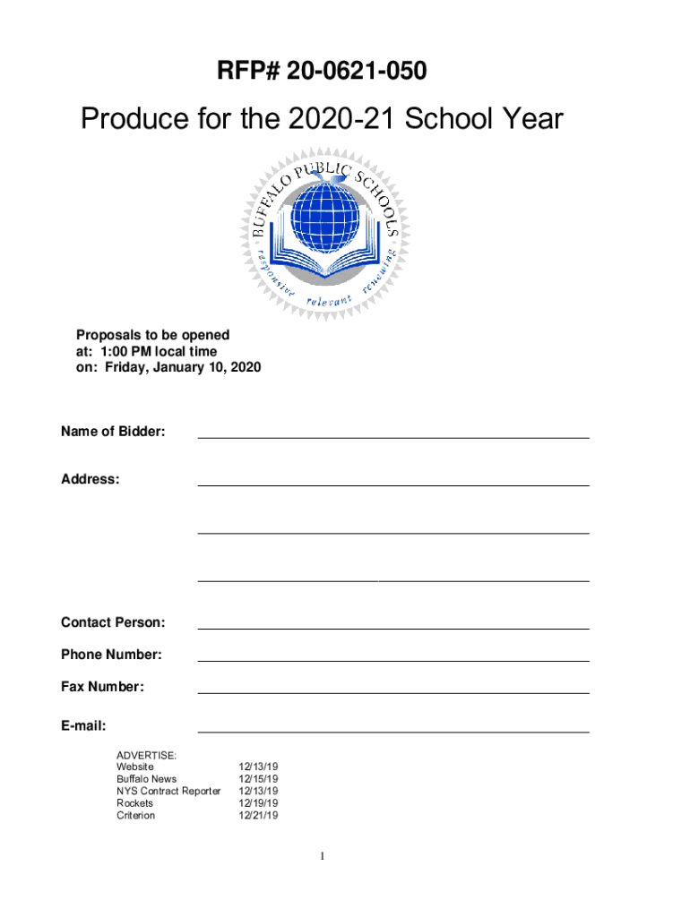 RFP# 200621050Produce for the 202021 School YearProposals to be opened at: 1:00 PM local time on: Friday, January 10, 2020Name of Bidder:___Address:_________Contact Person:___Phone Number:___Fax Number:___Email:___