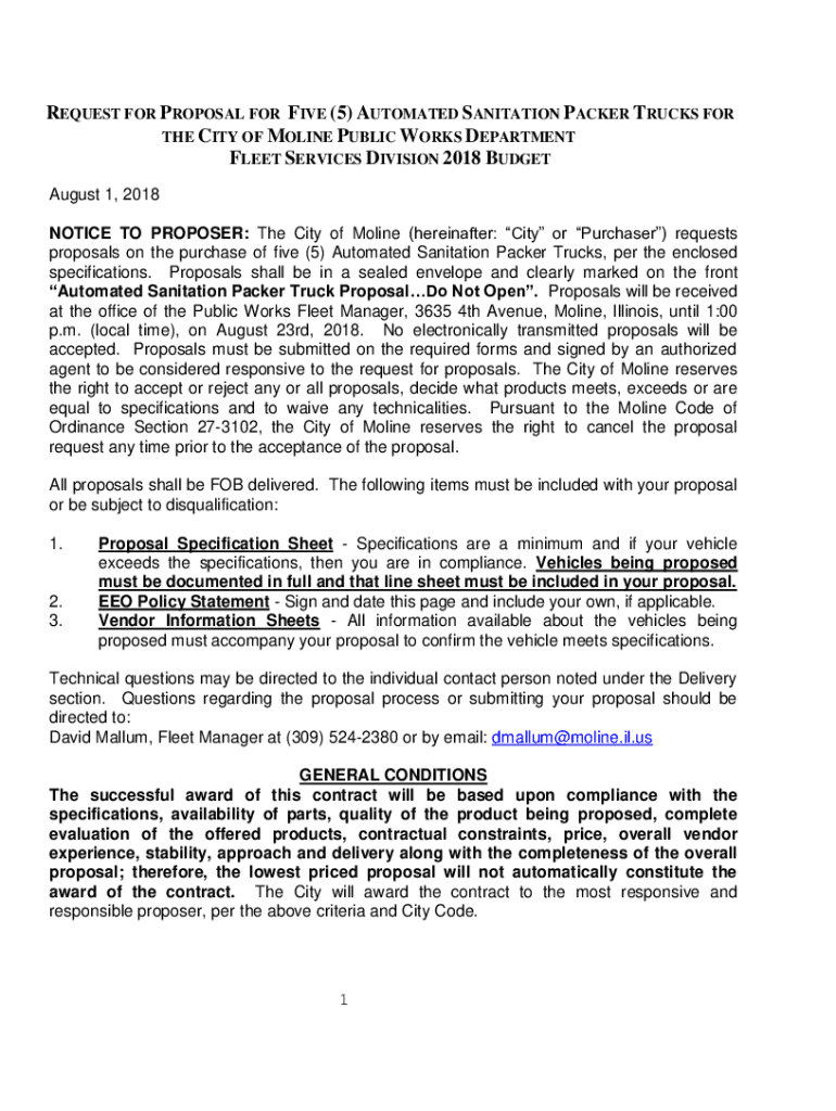 REQUEST FOR PROPOSAL FOR FIVE (5) AUTOMATED SANITATION PACKER TRUCKS FOR THE CITY OF MOLINA PUBLIC WORKS DEPARTMENT FLEET SERVICES DIVISION 2018 BUDGET August 1, 2018, NOTICE TO PROPOSER: The City