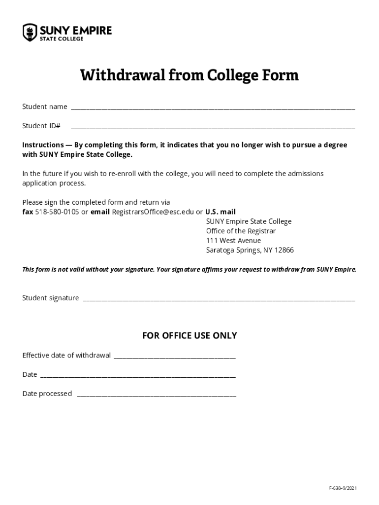 SUN EMPIRE STATE COLLEGEWithdrawal from College Form Student name ___ Student ID#___Instructions By completing this form, it indicates that you no longer wish to pursue a degree with SUN Empire State