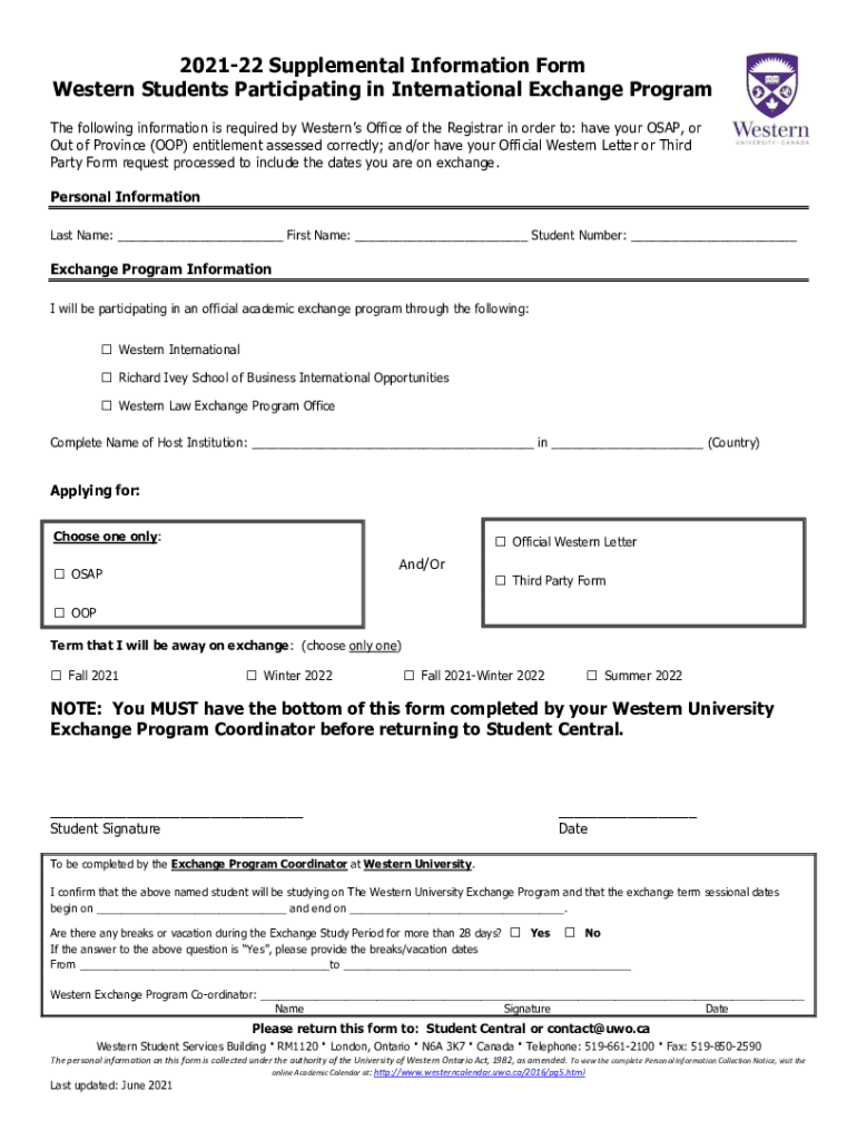 202122 Supplemental Information Form Western Students Participating in International Exchange Program The following information is required by Westerns Office of the Registrar in order to: have your