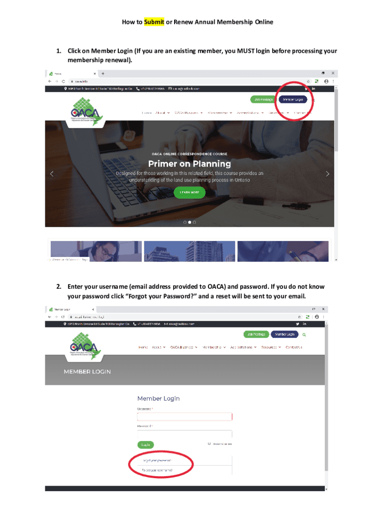 HowtoSubmit or Renew AnnualMembershipOnline1. ClickonMemberLogin(Ifyouareanexistingmember, youMUSTloginbeforeprocessingyour membership renewal).2. Enteryourusername(emailaddressprovidedtoOACA)and