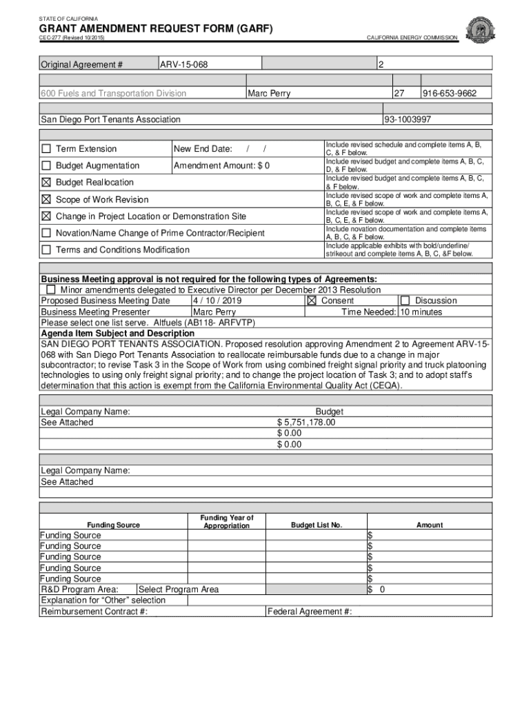 STATE OF CALIFORNIAGRANT AMENDMENT REQUEST FORM (GARY) CEC277 (Revised 10/2015)Original Agreement #CALIFORNIA ENERGY COMMISSIONARV15068Division 600 Fuels and Transportation DivisionAmendment #2Agreement