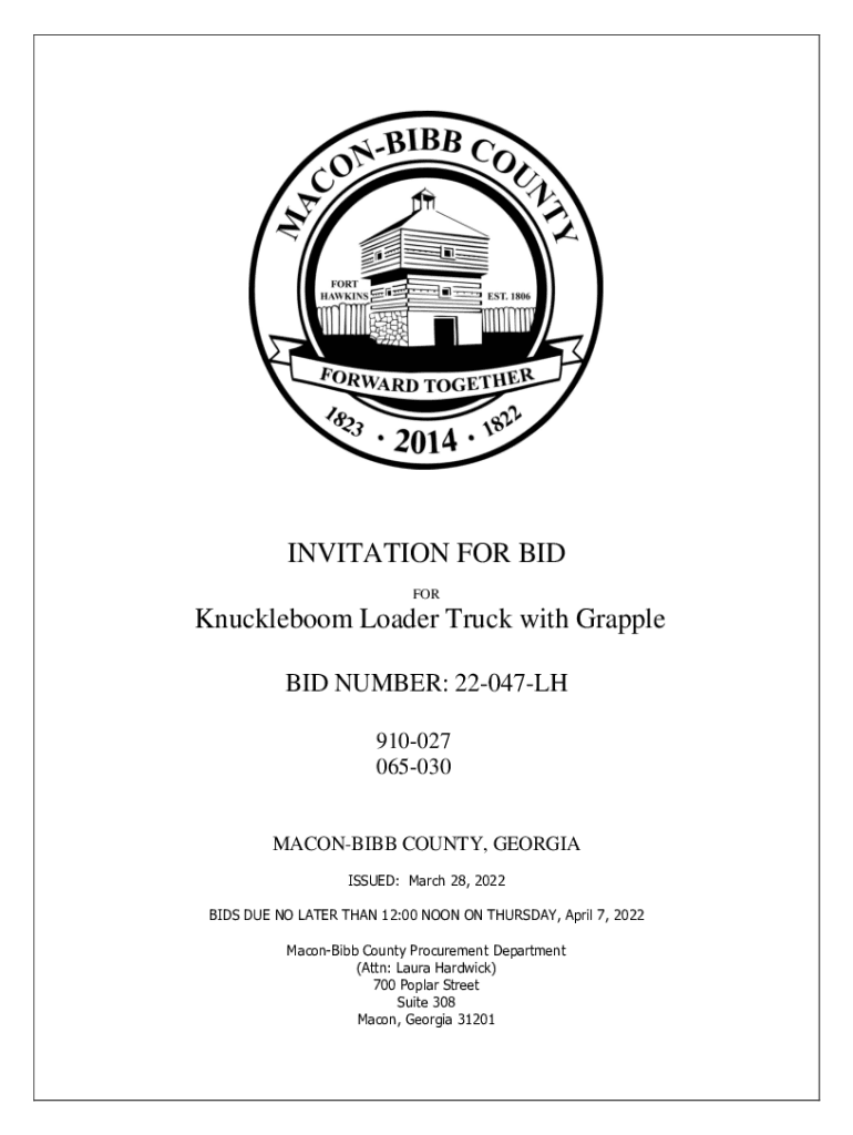 INVITATION FOR BID FORKnuckleboom Loader Truck with Grapple BID NUMBER: 22047LH 910027 065030MACONBIBB COUNTY, GEORGIA ISSUED: March 28, 2022, BIDS DUE NO LATER THAN 12:00 NOON ON THURSDAY, April