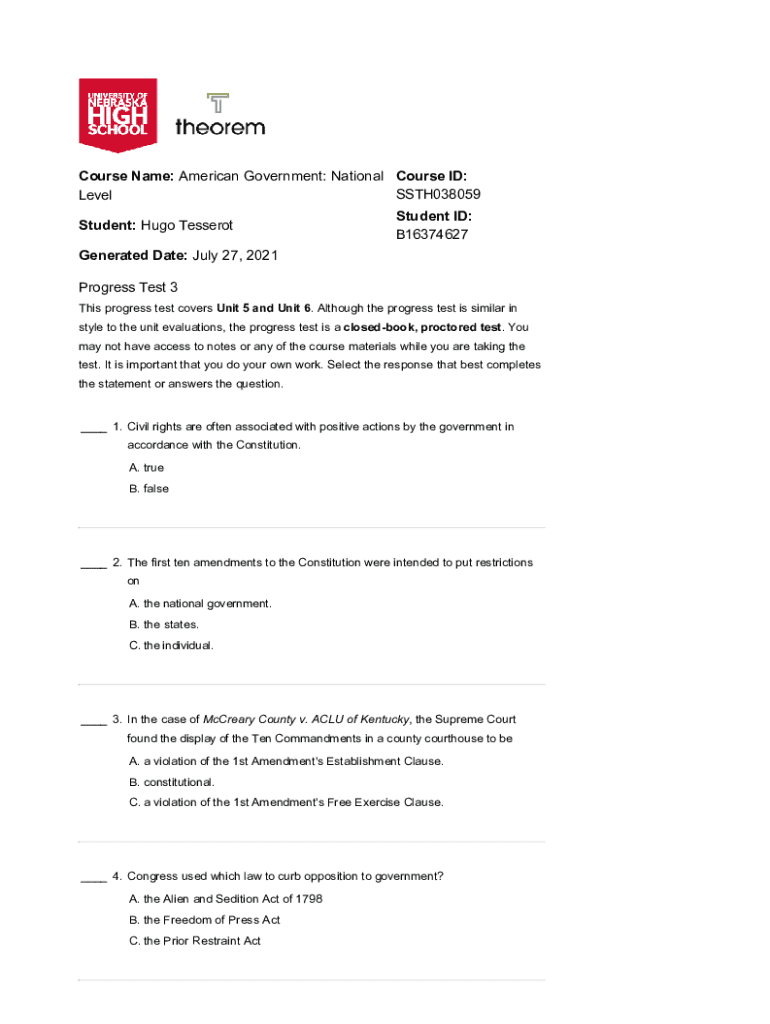 Course Name: American Government: National Course ID: SSTH038059 Level Student: Hugo TesserotStudent ID: B16374627Generated Date: July 27, 2021, Progress Test 3 This progress test covers Unit 5 and
