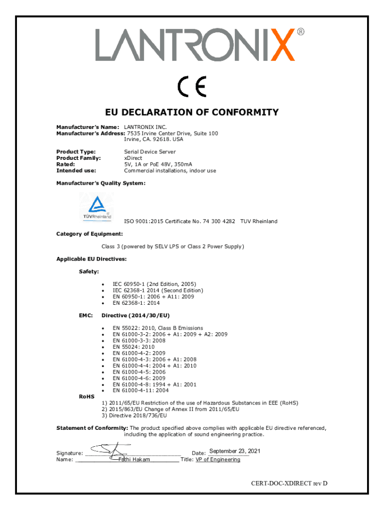 EU Declaration of Conformity is a document in which the manufacturer declares that the product complies with all relevant EU regulations and directives.