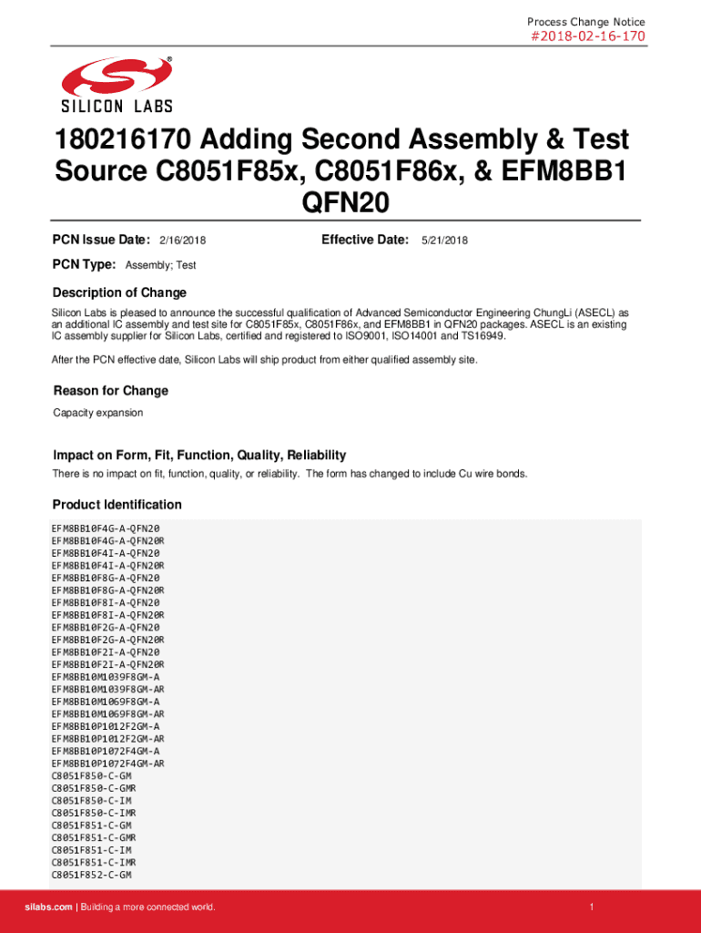 Process Change Notice#20180216170180216170 Adding Second Assembly & Test Source C8051F85x, C8051F86x, & EFM8BB1 QFN20 PCN Issue Date: 2/16/2018Effective Date:5/21/2018PCN Type: Assembly; Test Description
