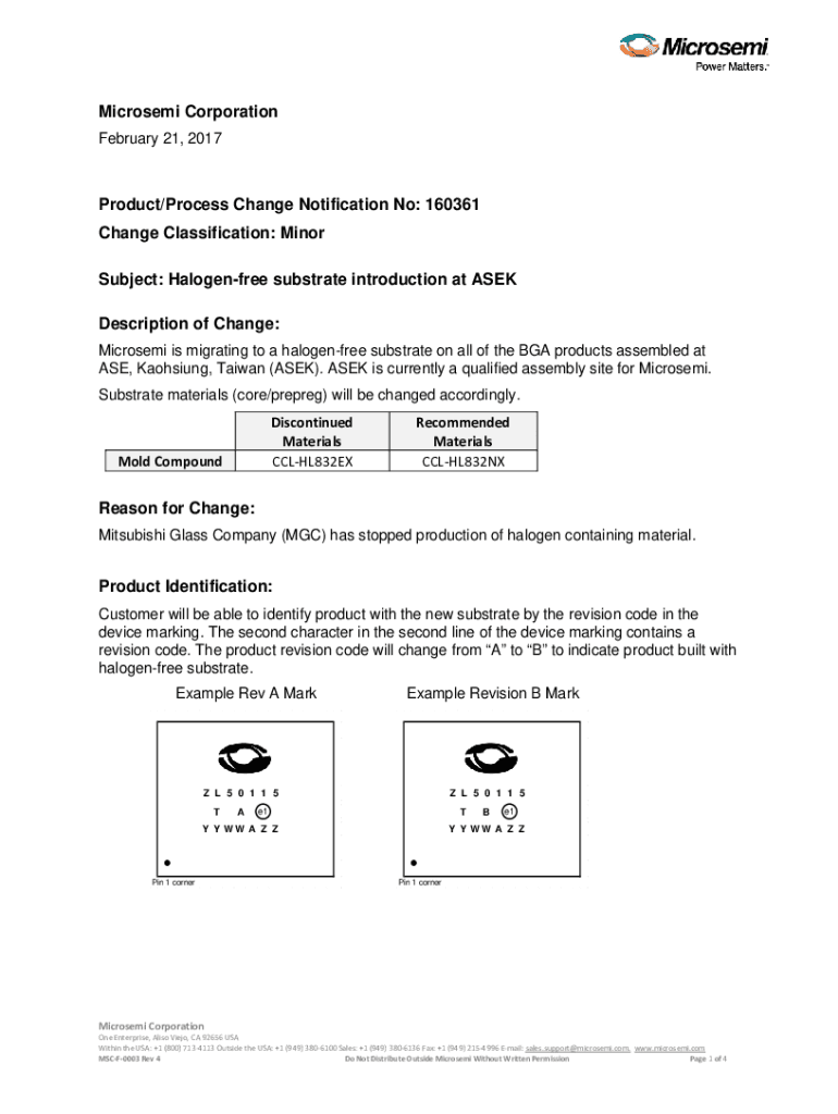 Microsemi Corporation February 21, 2017Product/Process Change Notification No: 160361 Change Classification: Minor Subject: Halogen free substrate introduction at ASK Description of Change: Microsemi
