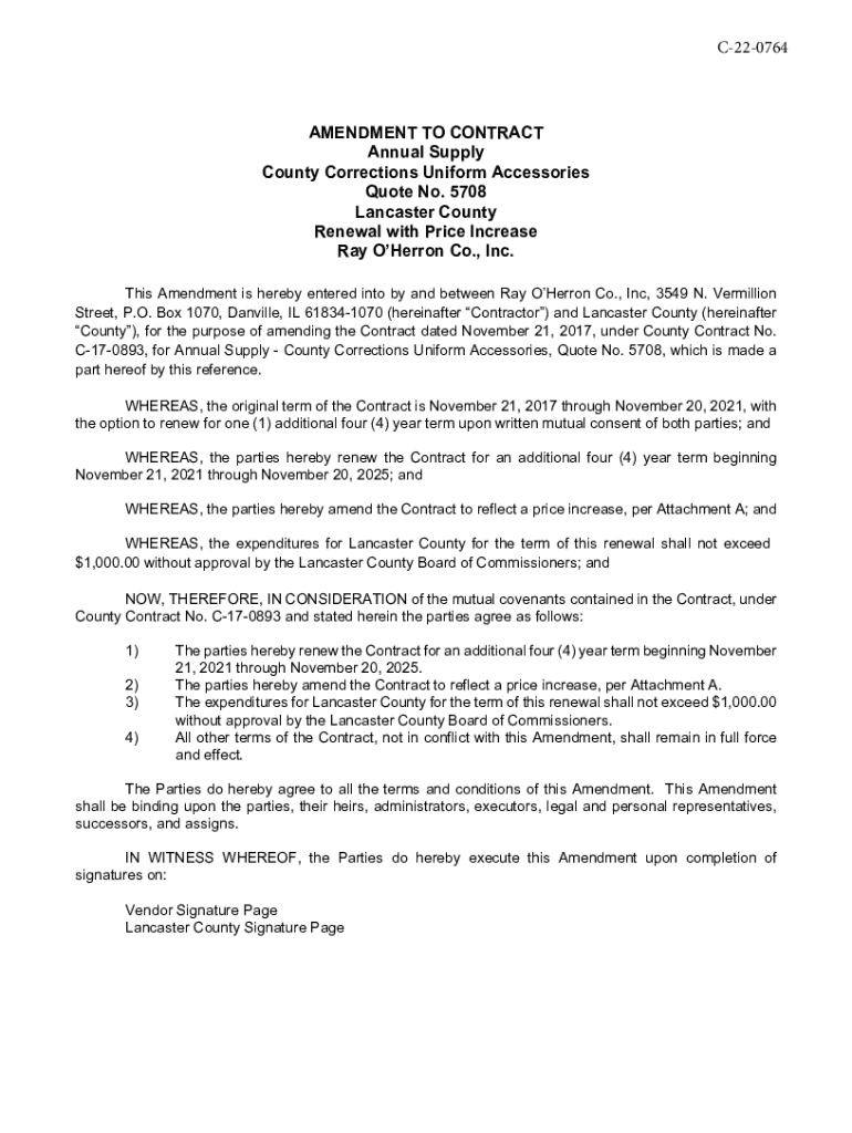 C220764AMENDMENT TO CONTRACT Annual Supply County Corrections Uniform Accessories Quote No. 5708 Lancaster County Renewal with Price Increase Ray Overrun Co., Inc. This Amendment is hereby entered