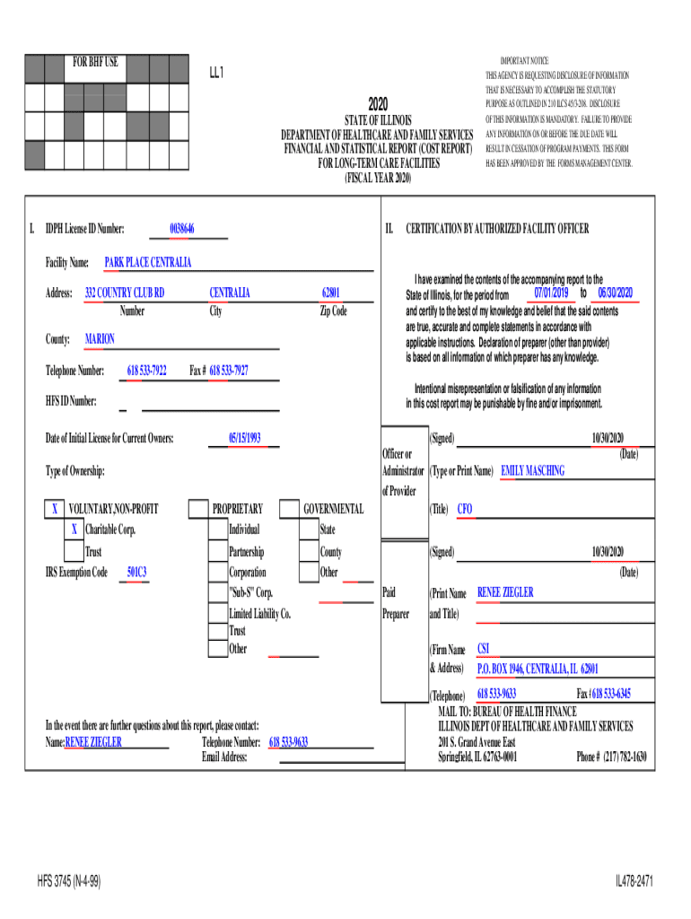FOR BHF USELL1 2020STATE OF ILLINOIS DEPARTMENT OF HEALTHCARE AND FAMILY SERVICES FINANCIAL AND STATISTICAL REPORT (COST REPORT) FOR LONGER CARE FACILITIES (FISCAL YEAR 2020) I.DPH License ID Number: