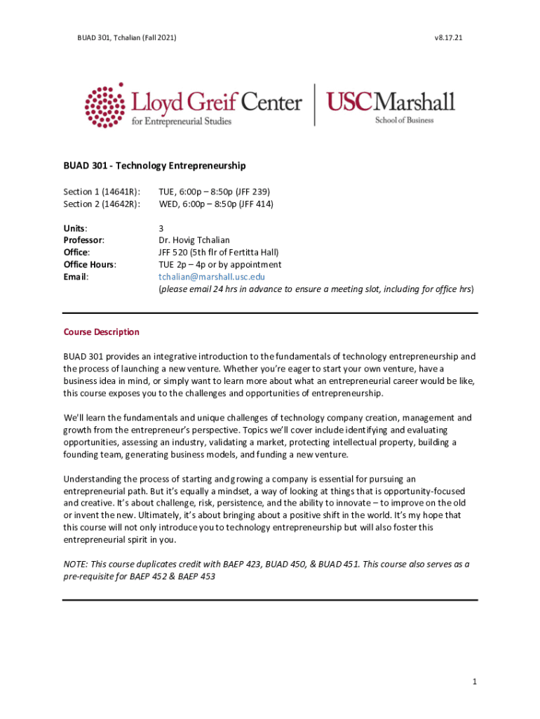 BAD 301, Chadian (Fall 2021)v8.17.21BUAD 301 Technology Entrepreneurship Sections 1 (14641R): Section 2 (14642R):TUE, 6:00p 8:50p (OFF 239) WED, 6:00p 8:50p (OFF 414)Units: Professor: Office: Office